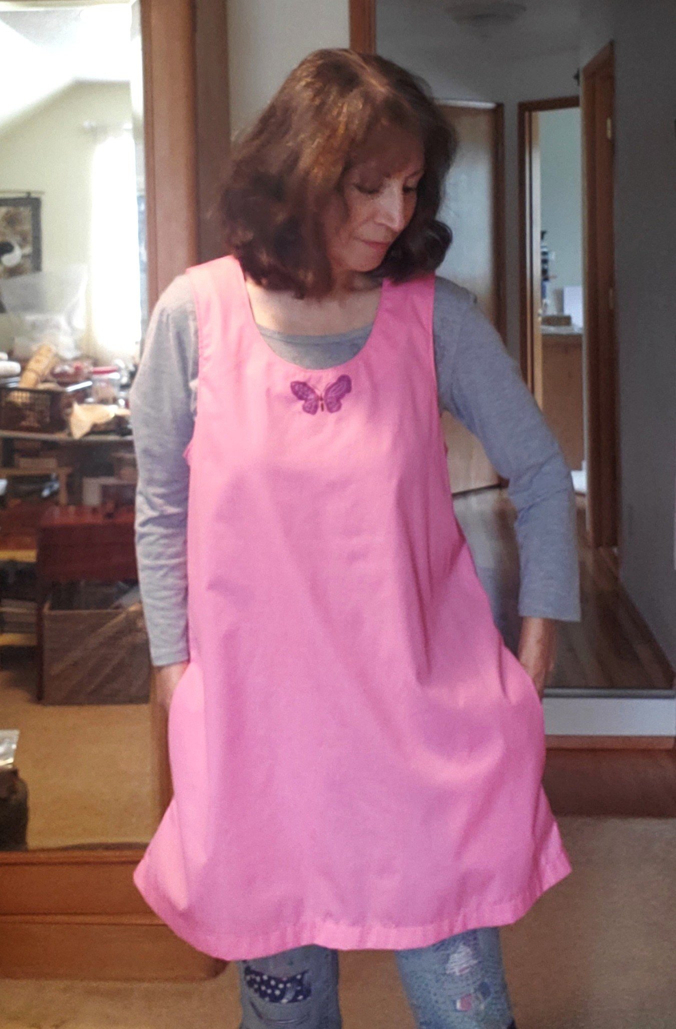 This pink tunic absolutely celebrates everything spring. A slightly shorter version of the Everyday Jumper, the Butterfly Tunic is a loose-fitting, slip-on style. Made of 100% cotton poplin for easy care. Hand-printed butterflies adorn the center front and the back yoke. Two roomy side seam pockets.