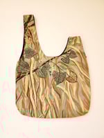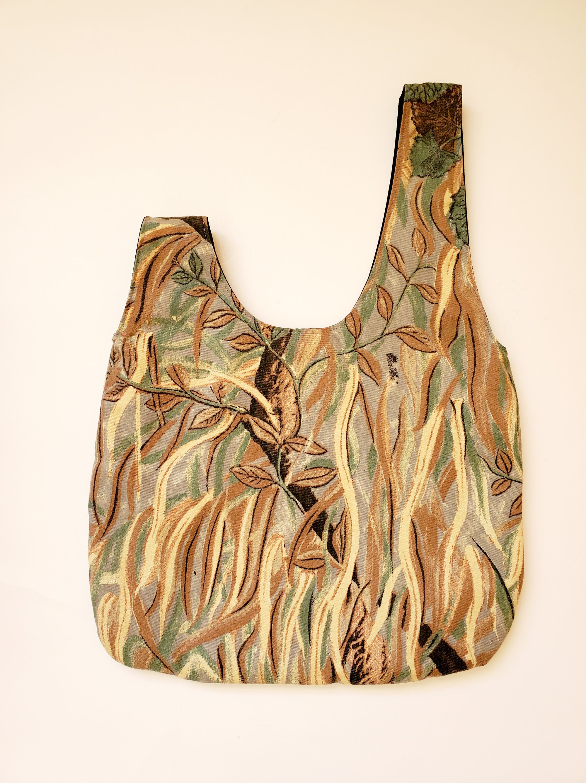 The Japanese-inspired knot bag is a classic marriage of simplicity, functionality, and style. Just slip the long handle through the shorter one and pull. The bag cinches itself closed. Brilliant! Our Leaf and Vine bag is large enough to carry quite a lot, but light enough to sling over the shoulder. The outer shell is made of 100% vintage cotton decor fabric. Leaves in shades of green and tan wind around dark charcoal branches over a sage background filled with painterly strokes of sepia, straw gold, and jade green. Truly a beautiful combination of colors. Lined with 100% charcoal cotton. One interior pocket large enough to hold a cell phone. The best thing about knot bags is that they are reversible! It's like getting two bags in one.