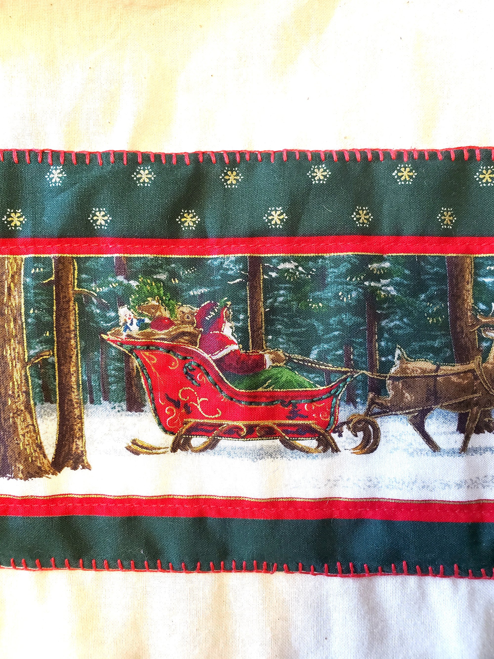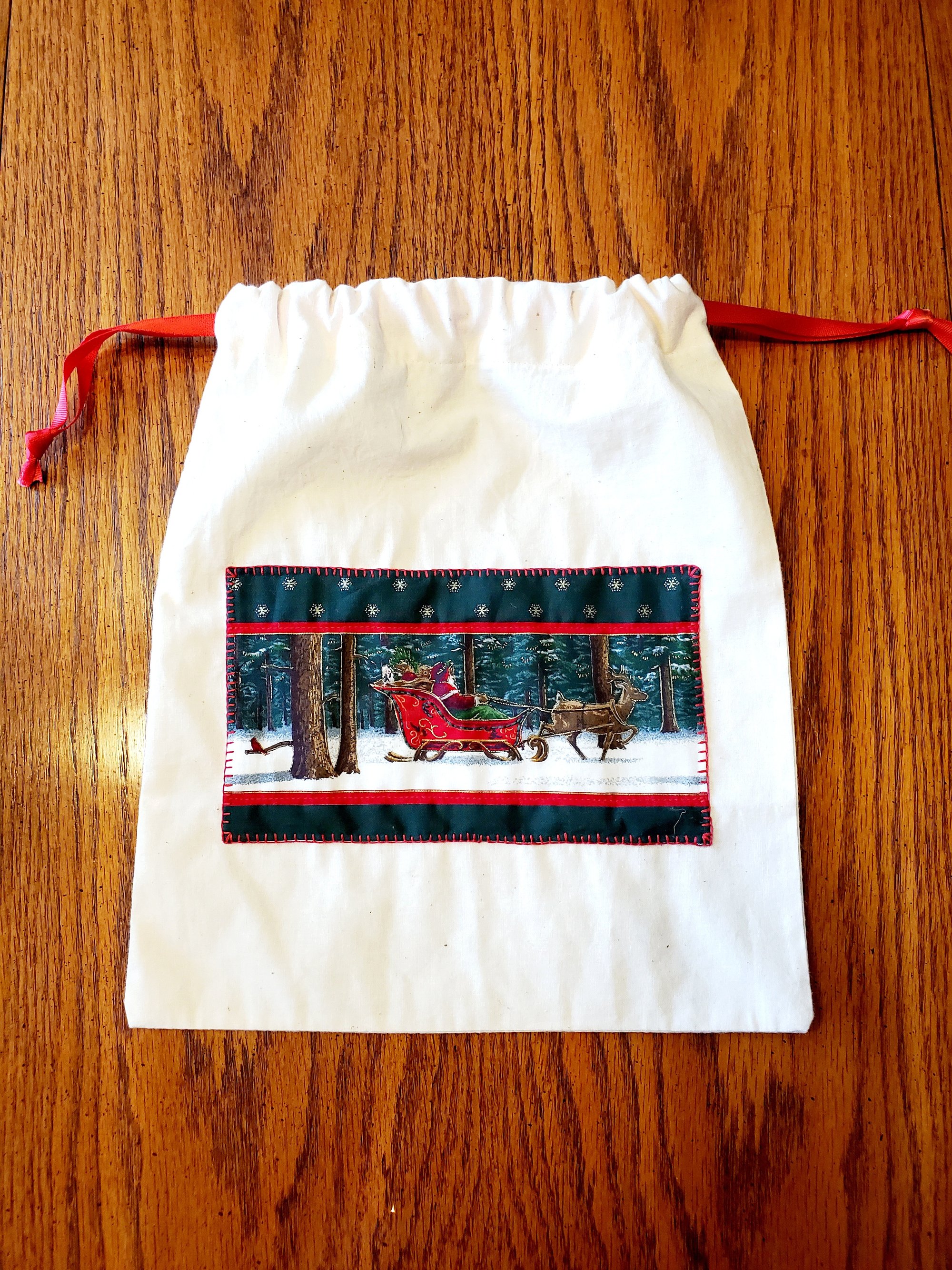 Make your Christmas gifting more sustainable with a beautiful, reusable fabric gift bag. The Santa Sleigh bag features a hand-appliqued panel depicting Santa driving his gift-laden sleigh through a snowy woods. The body of the bag is made of 100% organic cotton in a bright cream color. Scarlet gross grain ribbon drawstrings cinch the bag closed. The Santa Sleigh bag will surely elevate the cheer quotient of any goodies you pack inside it.